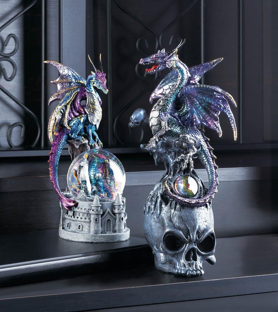• Give this mythical tabletop accent a shake and watch as sparkling glitter makes a splash in the snow globe. This figurine features a castle base, beautifully detailed blue and purple dragon in battle armor perched on top, and inside the snow globe is another dragon with a knight's sword.
