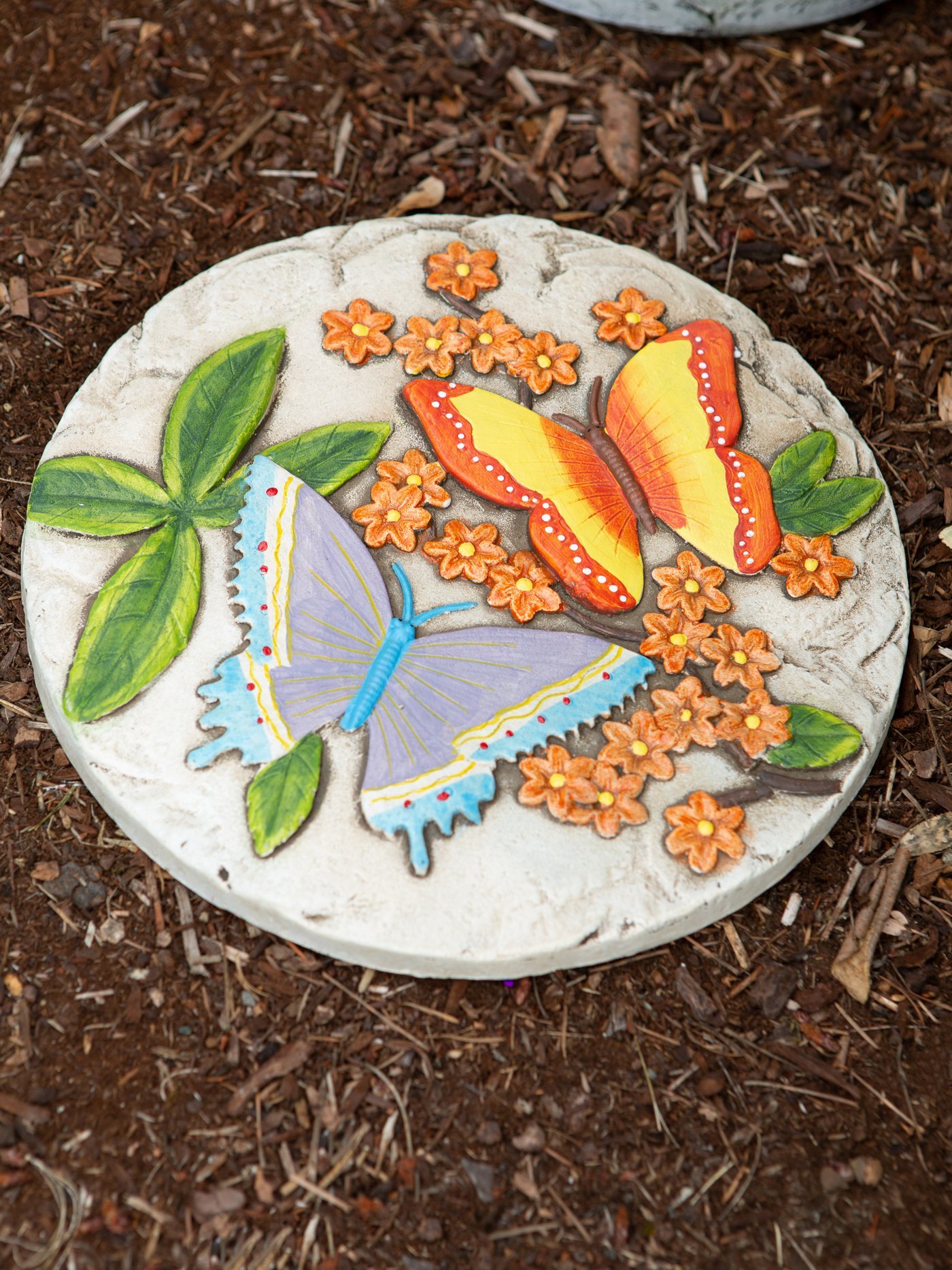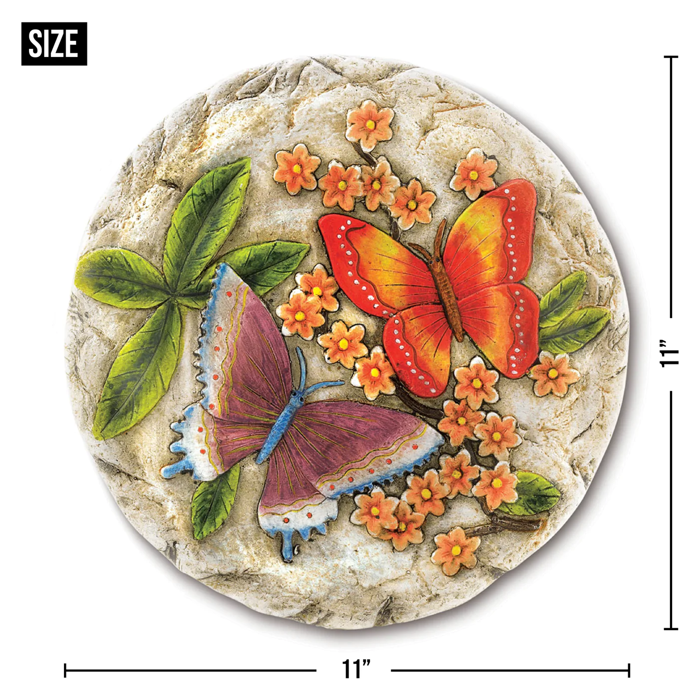 • A pair of vivid butterflies frolics amongst lush foliage, enlivening a bas-relief stepping stone with glowing colors and romantic sentiment. Sure to be the crowning jewel of your garden!